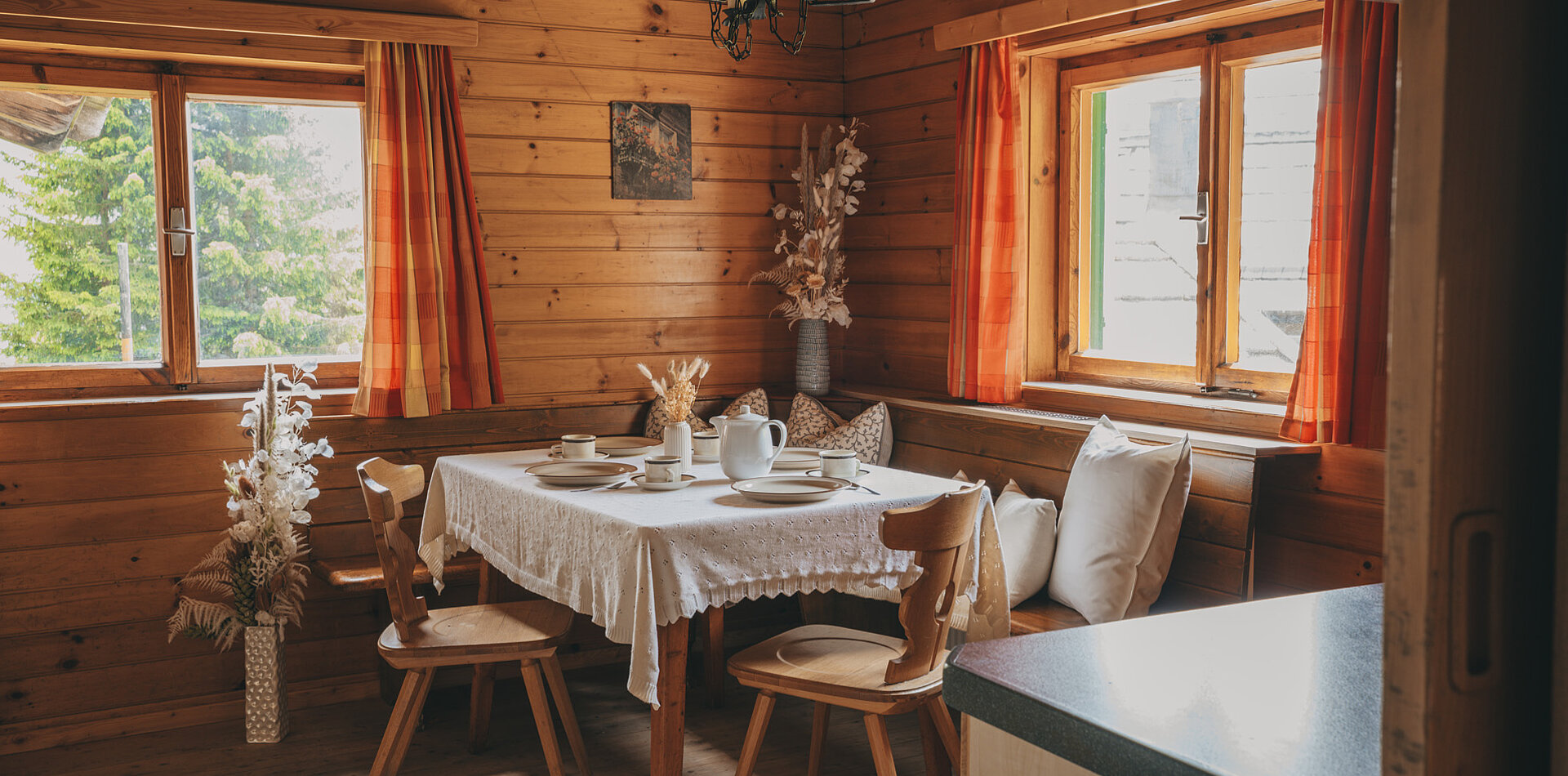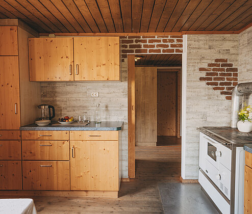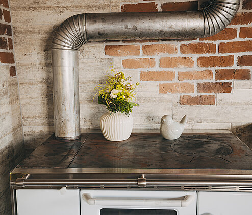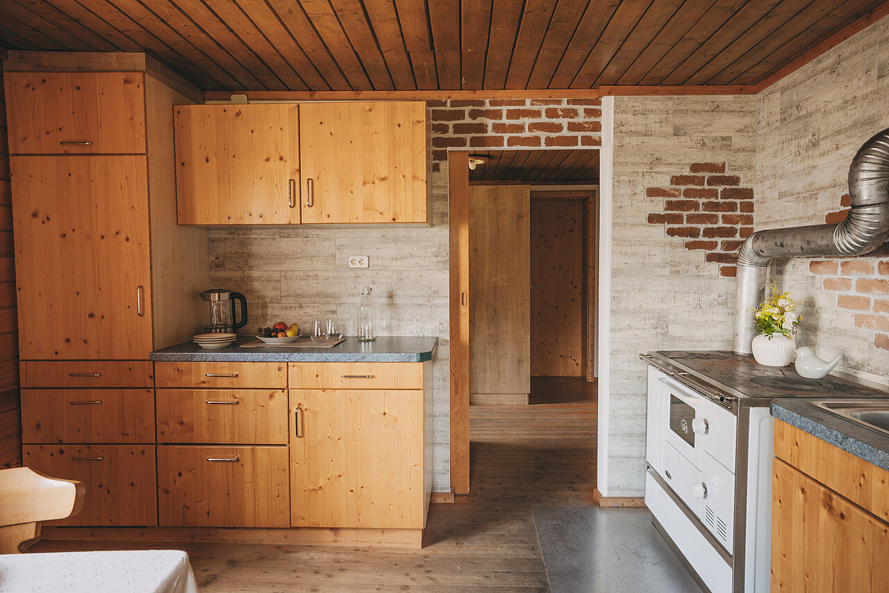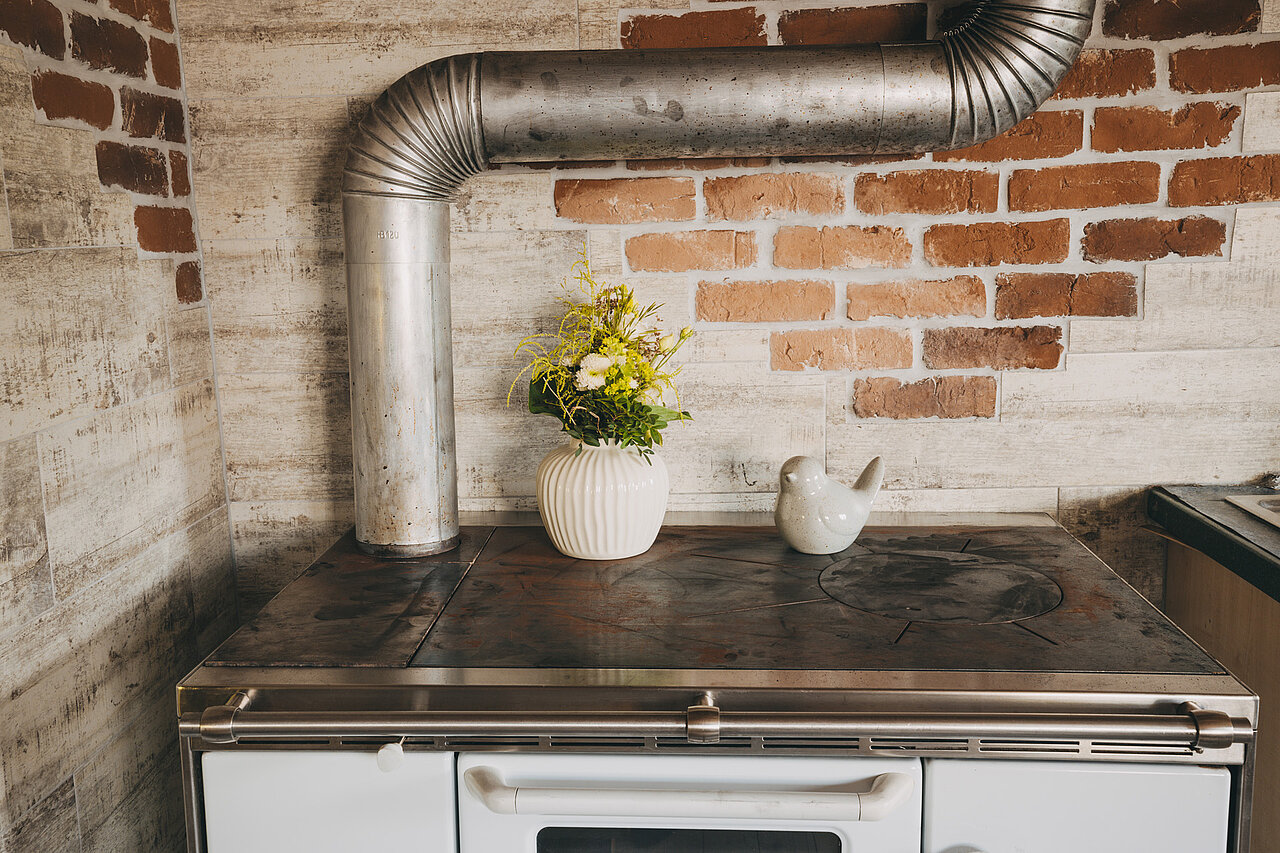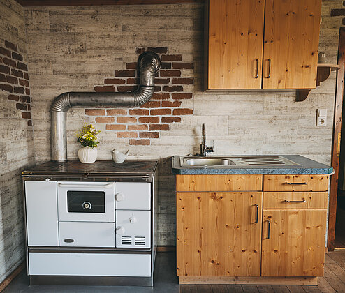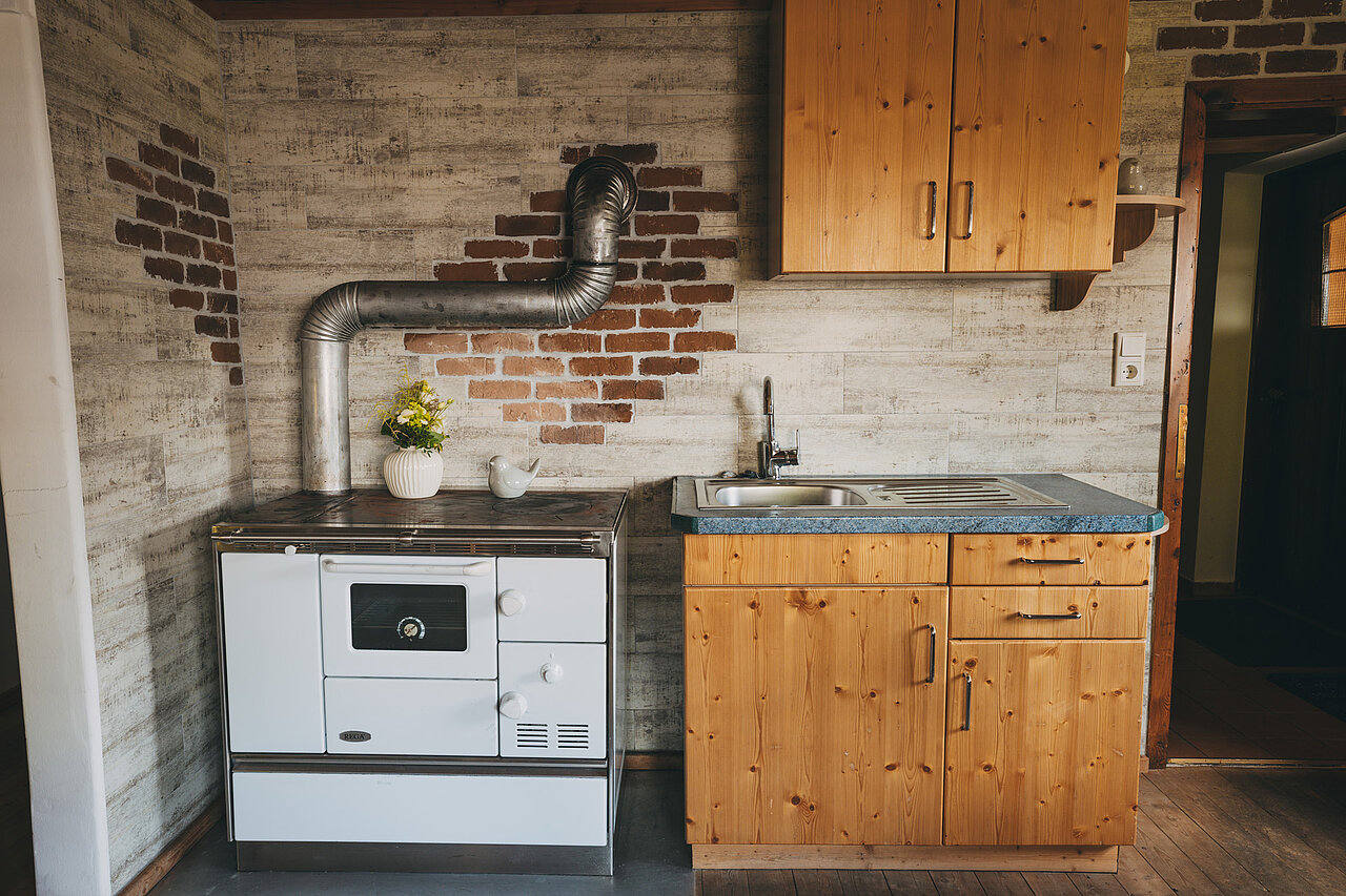 Wood-burning stove for cooking, bathroom with shower and WC.