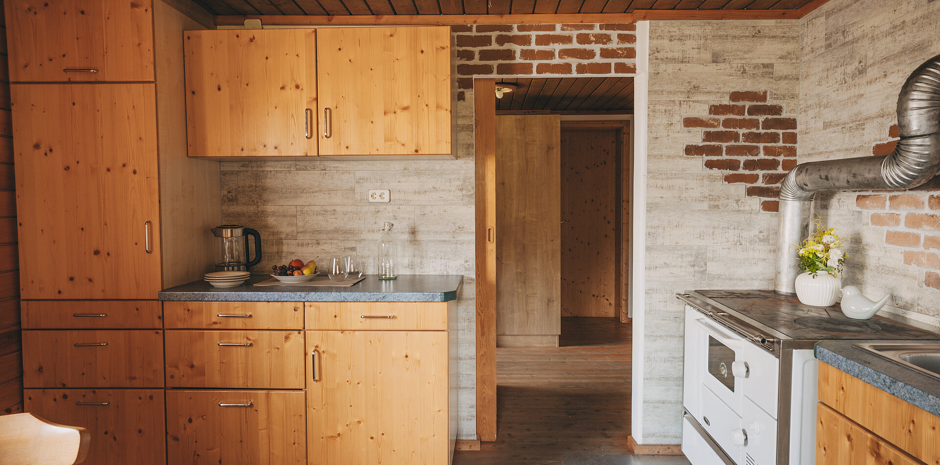 Wood-burning stove for cooking, bathroom with shower and WC.